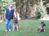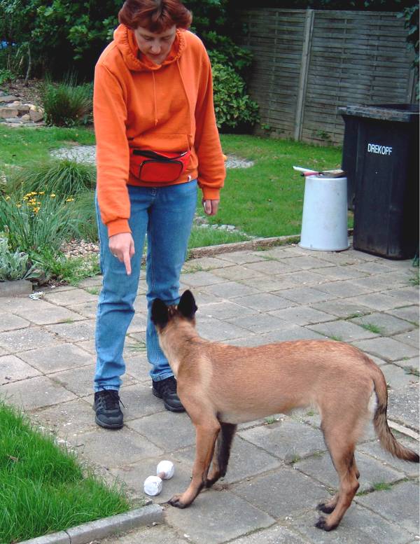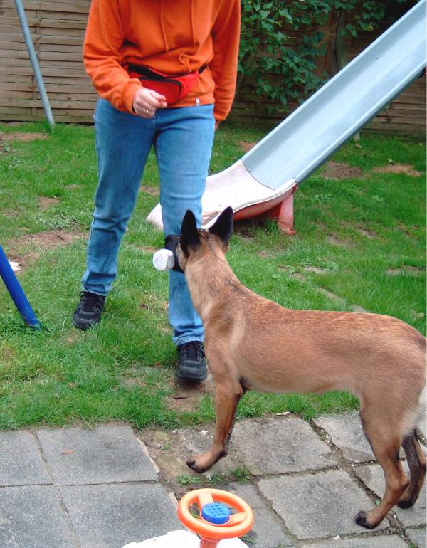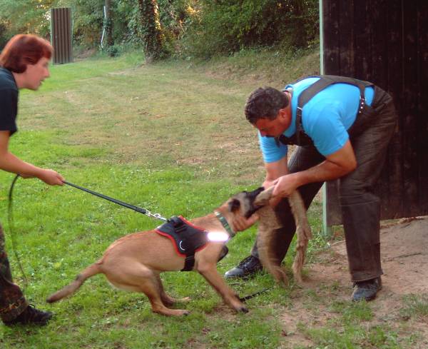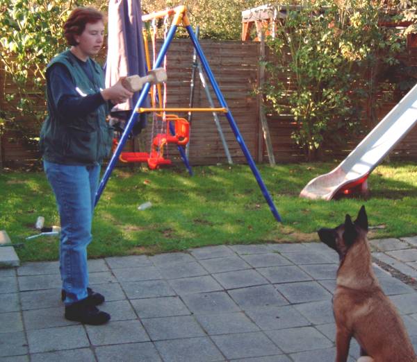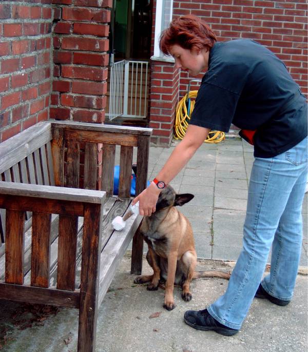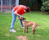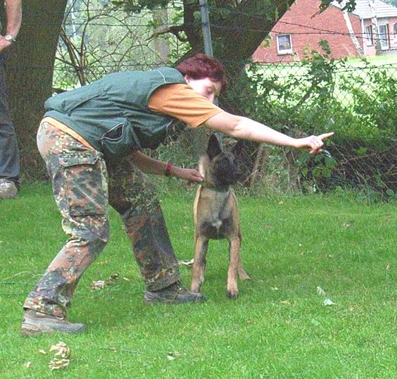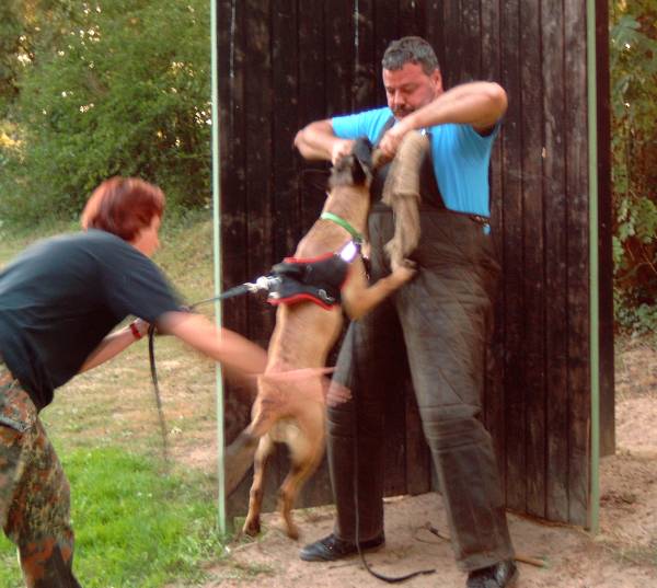 Revieren Einstellen des Hundes in die richtige Richtung; Revier ! Und los gehts! Umlaufen des Versteckes mit anschließender Belohnung beim Hundeführer. Ja, auch das mache ich schon mal außerhalb vom Schutzdienst, natürlich schon jetzt im Welpenalter. Viele Wege führen nach Rom, dieser hier ist meiner : Alice reagiert gut auf Futter, also wird eine Dose mit Futter ins Versteck gestellt. Anfänglich zeige ich ihr diese und entferne mich dann einige Schritte rückwärts. Mit dem Kommando Revier lasse ich sie los und sie darf ihre Belohnung holen. Mit dem Losspurten des Hundes bewege ich mich rasch zur anderen Seite des Versteckes, hat Alice ihre Dose dort leergefressen rufe ich sie zu mir ,belohne natürlich mit Click und zaubere eine zweite Dose mit Futter aus der Tasche. Bald wird sie sich schwer beeilen die eine Dose leer zu fressen um schnell zum Hundeführer zu kommen, denn da erwartet sie ja ebenfalls etwas Gutes. Nach einigen Übungsstunden wird die Dose im Versteck schon vorab dort positioniert ohne, dass der Hund dies sehen kann. Da der Ablauf immer gleich ist, wird der Hund auch hier im festen Glauben seine Belohnung dort zu finden, ins Versteck laufen. Wenn dieses Verhalten absolut verlässlich ist und einige Male wiederholt wurde, kann nun die Dose im Versteck einfach weggelassen werden. Der Click erfolgt wenn der Hund das Versteck umläuft, der Hundeführer wartet schon auf der anderen Seite mit der Futterdose in der Hand. Der Hund sollte nun verstehen, dass er durch Umlaufen des Versteckes an sein Triebziel kommt. In der Abteilung C ist das Revieren nun nur noch eine Gehorsamsübung, muss aber nicht erst im Schutzdienst erlernt werden. So kommt man, denke ich viel schneller und einfacher ans Ziel.
