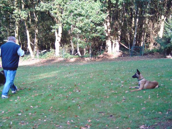 Ablage unter Ablenkung Abliegen; kein Problem! "Der da interessiert mich überhaupt nicht!!" Eigentlich haben wir die Ablage unter Ablenkung schon mit ca. 3 Monaten begonnen, aber "Beweisfotos" haben wir erst jetzt gemacht. Dafür sieht man hier ganz deutlich, dass die nun 6 Monate alte Hündin schon recht sicher abliegen kann. Angefangen haben wir nachdem das PLATZ relativ gut einstudiert war. Mit Hilfe der Futterhand wurde die Hündin ins Platz gebracht und dort für einige Sekunden, auf dem Boden, zwischen den Vorderläufen gefüttert. Mit einem CLICK wurde dann die Übung aufgelöst und ausgiebig gespielt. Von Übungsstunde zu Übungsstunde wurde die Zeit in der der Hund in der Ablage verweilen musste immer mehr verlängert. Dann wurde nicht mehr ständig gefüttert, sondern nur noch von Zeit zu Zeit. Der nächste Schritt wäre dann, dass sich der Hundeführer ein Stück vom Hund entfernt und ihm ab und zu einen Futterbrocken zuwirft. Steht Alice vorzeitig aus der Ablage auf, ertönt ihr wohlbekanntes "Nein" und sie wird ruhig wieder ins Platz gebracht. Bleibt sie liegen bekommt sie wieder Futter. Irgendwann, sinniger Weise zu einem Zeitpunkt indem die Ablage ruhig und stabil funktioniert, ertönt dann der CLICK und die Übung wird mit einem freien Spiel aufgelöst. Die Hündin wurde bisher zu keinem Zeitpunkt gestraft oder schroff ins Platz zurückgebracht. Ich baue auch hier im Moment noch darauf, dass der Hund selbst die richtige Entscheidung treffen wird. Für Druck ist später immer noch Zeit, falls es nötig werden sollte. Die Ablage unter Ablenkung klappt jetzt etwa für 10 Minuten sehr stabil und wird danach auch von mir abgebrochen, damit kein Fehler auftritt der korrigiert werden müsste.