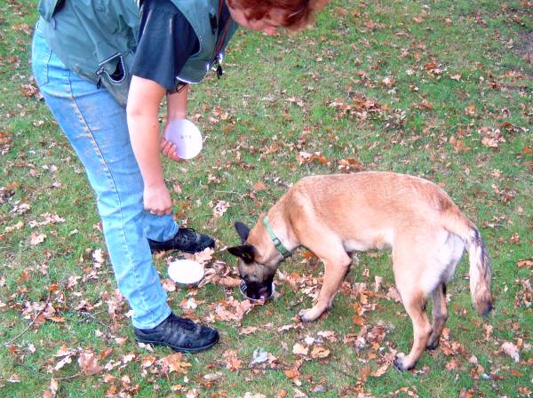 Beginn der Fährtenarbeit in der 8. Lebenswoche Such! Fährtentraining, wann immer Gelände zu finden ist. Futter aufsammeln findet Alice toll! Das Wechseln von einem Fußstapfen zum nächsten hat sie schon gut drauf und arbeitet hierbei schon absolut selbstständig! Mit dem Training in der Abteilung A haben wir ab der 8. Woche begonnen. Getreten wird eine ca. 2m lange Fährte mit kurzer Schrittlänge. In jedem Tritt liegt ein Stück Schinkenwurst für den Hund bereit. Es wird darauf geachtet, dass der Welpe beim Absuchen den Kopf von Fußabdruck zu Fußabdruck wendet und so eine Pendelbewegung von rechts nach links entsteht. Am Ende der Fährte befindet sich ein Gegenstand, der allerdings nicht verwiesen , sondern nur wahrgenommen werden soll. Dieser wird mit einem Click bestätigt und mit Futter aus der Tasche des Hundeführers ausgiebig belohnt.