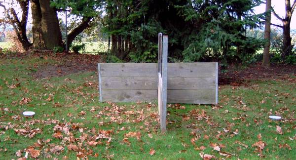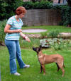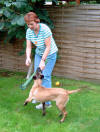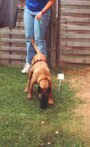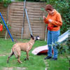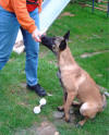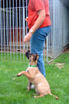 Der Hürdensprung Vorbereitung; die Hürde wird auf die entsprechende Trainingshöhe gebracht, zwei Futterdosen dienen als Ziel und Bestätigung nach erfolgtem Sprung. Einstellen des Hundes zum Ziel beim Hinsprung; Belohnung nach freiem Springen Kommando HOPP! Rücksprung und Belohnung beim Hundeführer Erwünschte Verknüpfung : Hin- und Rücksprung gehören immer zueinander! Alice ist nun schon 6 Monate alt und da sie sowieso den ganzen Tag herum hüpft, als ob sie Sprungfedern gefressen hätte, können wir genauso gut mit dem springen über die 1m Wand beginnen. Natürlich wird die Hürde erst einmal auseinander genommen, so dass die zu meisternde Höhe bei der ersten Übungsstunde ausschließlich aus einem einzigen Brett besteht. Diese Distanz hat den Vorteil, dass sie a: leicht übersprungen werden kann ohne vom Hund berührt zu werden und b: der Hund ist in der Lage zu sehen was sich hinter der Hürde befindet, kann er dies nicht könnte sich hier eine gewisse Unsicherheit einschleichen, die uns am freien Arbeiten des Hundes hindert. Auch bei dieser Übung möchte ich die Hündin nur passiv beeinflussen und nicht zum Springen zwingen. Vielmehr soll sie frei und selbstständig ihre eigene Sprungtechnik entwickeln, denn wer sollte besser wissen wann man am besten abspringt, wenn nicht der Hund selbst. Die Hürde an sich hat auch zunächst einmal überhaupt nichts mit Apportieren zu tun. Alice soll nun erst mal Hin- und Rücksprung miteinander verbinden, so dass es später egal sein wird, wo sich der Hundeführer befindet. Hin- und Rücksprung gehören einfach immer zusammen! Damit für den Hund ein gewisser Anreiz entsteht das Hindernis zu überspringen, wird eine gut sichtbare Dose mit Futter hinter der Wand positioniert. Nun haben wir ein konkretes Ziel, das wird dem Hund helfen den richtigen Punkt zum abspringen zu finden und wir benötigen keine Zwangseinwirkung. Ich halte Alice so dicht vor der Hürde, dass ein Vorbeilaufen kaum möglich ist und mache sie auf das Futter aufmerksam. Dann wird sie losgelassen, beim Überspringen des Hindernisses erfolgt der CLICK und auf der anderen Seite darf gefressen werden. Idealer Weise könnte nun eine Hilfsperson den Hund neu einstellen, damit der Hundeführer Zeit hat eine zweite Futterdose auf der anderen Seite auf zu stellen und wir verfahren wie gehabt. Alice neigt nicht dazu dem Hindernis aus zu weichen, es ist ja auch noch nicht wirklich hoch. Normalerweise stellt sich ein solcher Fehler auch nicht ein, wenn man nicht zu schnell die Höhe verändert und der Hund sein Ziel gut sehen kann. Später wird ihm dann diese Übung zur Gewohnheit werden und er wird seine Futterdose an der anderen Seite der Hürde erwarten. Sollte er doch einmal vorbei laufen, darf natürlich auch keine Bestätigung erfolgen. Am besten steht immer eine Hilfsperson bereit, die dann die Futterdose einfach wegnimmt wenn die Hürde verweigert wurde. Die Übung wird mit einem Wort für "Falsch gemacht" z. B. NEIN! beendet und von Neuem begonnen. Der Hund soll möglichst aus eigenem Antrieb verstehen das es eine Belohnung nur nach dem Sprung gibt. Nach vielen, vielen Übungsstunden wird die Hürde immer ein Bisschen höher gestellt, je nach alter und Sprungtalent des Hundes natürlich. Hierbei ist darauf zu achten, dass der Hund niemals eine Negativverknüpfung mit der Hürde haben darf. Also lieber noch mal ein Brett rausnehmen wenn`s mal nicht so gut klappt. Hat der Hund nach einigen Trainingseinheiten dann wirklich verstanden, also Springen=CLICK=Triebziel, dann wird im Laufe der Zeit nur noch nach dem Rücksprung belohnt. Das Lernziel Hin- und Rücksprung gehören zusammen sollte dann erreicht sein. Bei diesem Übungsaufbau wird der Hürdensprung schnell zur Lieblingsbeschäftigung des Hundes und wir erhalten einen sicher springenden und freudig arbeitenden Teampartner. Viele Leute beginnen den Hürdensprung erst mit dem erwachsenem, körperlich ausgereiften Hund und ziehen ihn dann gleich über die komplette 1 m Wand, am Besten noch mit einem Leinenruck mit dem Ergebnis das der Hund dann die Hürde negativ verknüpft und diese dann ständig abtaxiert und nie den richtigen Punkt zum abspringen findet. Zögerndes Springen, Aufsetzen oder Anstoßen ja sogar verweigern der Hürde sind dann die Folge. Auch finde ich, dass der Apport erst hundertprozentig am Boden klappen muss, bevor man mit dem Bringen über die Wand beginnt. Weil ich leider kein besonderes Talent zum geraden Werfen habe, ist es für mich ebenfalls sehr wichtig, dass der Hund von allein weis das der Hürdensprung aus Hin- und Rücksprung besteht, sodass bei Schräglage des Holzes nicht die Gefahr besteht, das er sofort zum Hundeführer läuft nur weil der aus seiner Sicht, nicht genau hinter der Hürde positioniert ist. Meine Bijou hat das auf diese Art und Weise gut begriffen und mir so einige Male "das Leben gerettet!!