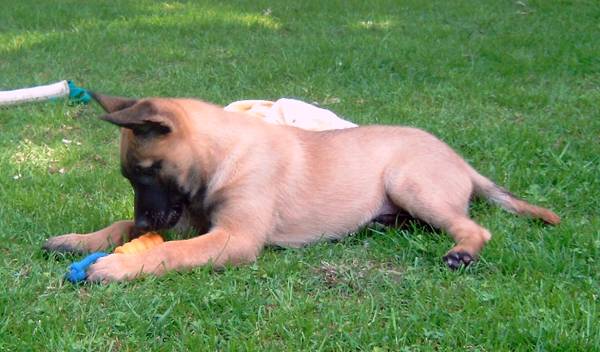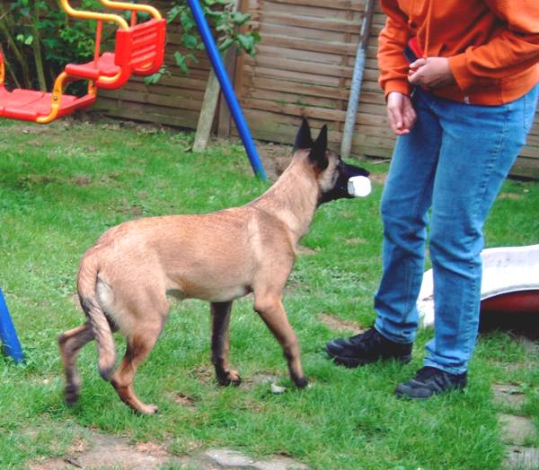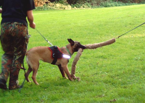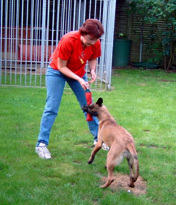Beutespiel Beutetraining ist natürlich auch ganz wichtig. Hier greifen wir wieder auf die bewerte Methode nach Lind zurück, wir finden die Bücher nach wie vor ganz klasse! Ist ja bei Bijou auch ganz gut gelaufen. Beute- und Spieltriebförderung halte ich auch gerade im Welpenalter für sehr wichtig. Immerhin baut ja die Abteilung C in wesentlichen Punkten hierauf auf. Auch hier lasse ich mich gern durch die Bücher von E. Lind zu interessant gestalteten Beutespielen inspirieren. Im Vordergrund steht hier das Vertrauensverhältnis Hund Hundeführer. Der Welpe darf und soll beim Spielen mit der Beute ruhig über den Hundeführer herlaufen und Körperkontakt aufbauen, daher setze ich mich zu Alice auf den Boden um möglichst engen Kontakt beim Spielen herstellen zu können. Drohbewegungen mit den Händen oder Füßen werden ins Spiel mit eingebaut und gehören einfach dazu. So haben wir später auch kein Problem mit der "Schlaghand" des Schutzdiensthelfers.