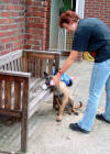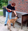 Dritter Teilschritt zum Apport ; selbständiges Aufnehmen Ruhiges Halten bis zum Click, ist die Voraussetzung für den nächsten Schritt. Selbstständiges und freiwilliges Greifen nach dem Holz aus erhöhter Position, danach Click und Futter Bisher hat Alice in Einzelschritten gelernt, nach dem Holz in meiner Hand zu fassen und danach es ruhig für einige Sekunden zu halten. Dieser Schritt klappt nun reibungslos auch in fremder Umgebung. Nun soll sie lernen, das Holz selbst auf zu heben. Wir möchten diese neue Übung wieder in kleinen Schritten vorbereiten um den noch sehr jungen Hund nicht zu überfordern und seine Freude an der Arbeit zu erhalten. Also lege ich das Holz auf einen erhöhten Punkt, möglichst in Augenhöhe des Hundes (hier eine Bank). Da das Aufnehmen für den Hund doch eine sehr knifflige Angelegenheit sein kann, halte ich das Holz erst einmal an einem Ende fest, damit Alice den Steg besser greifen kann. Es liegt jetzt etwas schräg und kann so leichter aufgenommen werden. Zunächst ist der Hund meist etwas verunsichert, weil ihm das Holz nicht mehr direkt angeboten wird. Jede Bewegung des Hundes in Richtung Holz wird dann von mir mit einem Wort für "Du bist auf dem richtigen Weg Deine Belohnung zu bekommen" in dem Falle GUT, bestätigt. Dieses dem Hund bekannte Hörzeichen signalisiert "Prima, Weiter so!" und beugt einer zu schnellen Frustration beim einstudieren neuer Übungen vor. Natürlich kennt Alice dieses Wort schon aus anderen Übungen. Ich benutze es gern um die Zeit bis zum Click etwas hinaus zu zögern. (Z. B. beim Entfernen des Hundeführers vom abliegenden Hund usw.) Greift der Hund deutlich nach dem Holz wird sofort geclickt! In weiteren Übungseinheiten wird die Zeit bis zum Click immer weiter hinaus gezögert. Wir warten dann bis der Hund das Holz wirklich im Fang hat und nach weiteren Übungsstunden wird erst geclickt wenn der Hund das Holz einige Sekunden festgehalten hat. Der nächste Schritt wäre dann, das wir das Holz nicht mehr schräg halten sondern einfach auf die Bank legen. Wenn auch diese Hürde genommen ist, werden wir dazu über gehen den Hund das Holz vom Boden aufnehmen zu lassen. Aber bis dahin dauert es noch etwas.