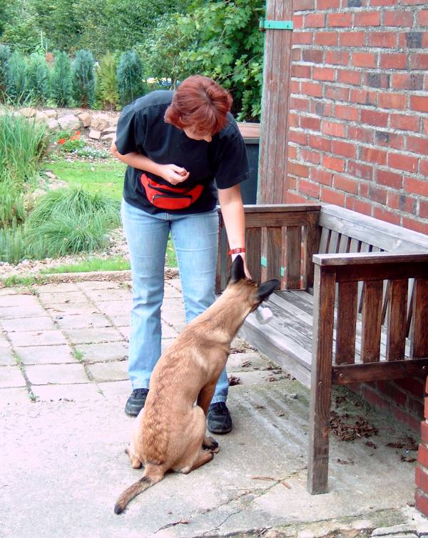 Beginn Platzübung Platzübung Mit der Sitzübung haben wir begonnen und danach gleich das Platz einstudiert. Wir finden es klappt schon ganz gut. Nächste Woche arbeiten wir dann am Steh immer positiv verstärkt durch Clicker. Bei Alice klappt das Platz ganz gut, indem ich mit meinen Beinen einen "Tunnel" baue und sie hindurchlaufen lasse. Um an ihr Futter zu gelangen muss sie runter auf den Boden; Click, Futter und bald sitzt auch diese Übung. Klar die Hilfestellung wird noch abgebaut. Die Übung so auf zu bauen hat den wesentlichen Vorteil, dass der Bewegungsablauf sehr viel schneller erfolgt als wenn der Hund sich erst aus dem Sitz heraus hinlegt. Ich habe mir diese Methode aus den Büchern von E. Lind abgeschaut, der viel mit passiven Hilfen arbeitet.