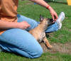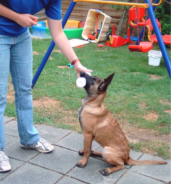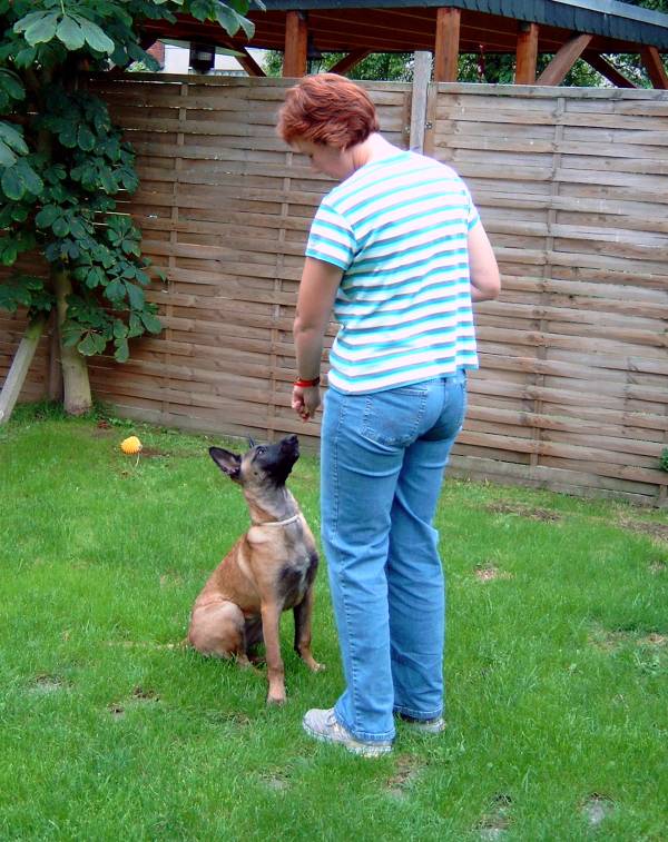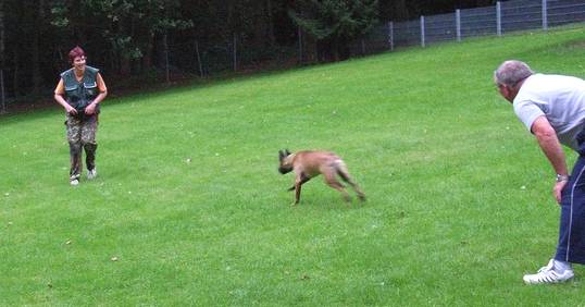Hereinkommen Gespanntes Warten; "hey lass mich nicht allein!!" Die Hilfsperson lässt den Hund nach Kommando des Hundeführers frei. Alice muss nicht, sondern darf endlich zum HF laufen! Das schnelle Hereinkommen nach dem Abrufen, beispielsweise aus dem Platz heraus trainiere ich erst einmal getrennt von den Übungen. Einem Welpen ist es von Natur aus unangenehm allein gelassen zu werden. Diese Eigenschaft kann man nutzen in dem man eine Hilfsperson bittet den Hund am Halsband fest zu halten damit der Hundeführer sich von seinem Welpen entfernen kann. Hierbei darf der Hund ruhig etwas in "Panik" geraten. Das erlösende Kommando vom Hundeführer gibt den Hund frei und er wird ganz sicher schnell und auf direktem Wege zu ihm laufen. Anschließendes Spiel belegt die Situation beim Hundeführer positiv und verstärkt den von uns gewünschten Effekt. Wenn keine Hilfsperson zur Stelle ist, kann man sich auch auf einem Spaziergang einfach mal verstecken wenn der Welpe nicht hinsieht. Ein Bisschen "zappeln" lassen und dann das Kommando geben, ausgiebig spielen. Diese Übung fördert ebenfalls die Bindung zum Hundeführer und ist die beste Vorbereitung für ein explosives und geradliniges Hereinkommen.