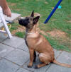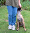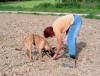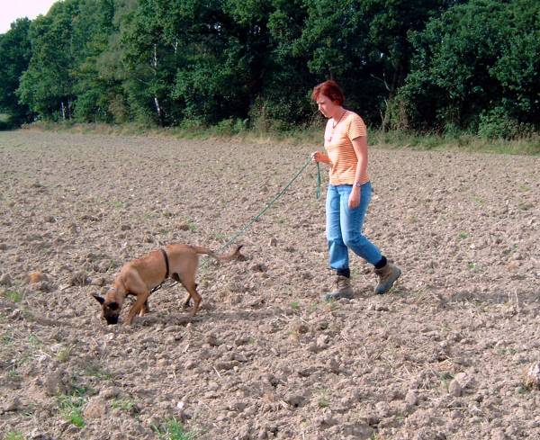 Zweiter Lernschritt in der Abteilung A Fährtenansatz mit "Mini-Böttchergeschirr" Erwartungsvoller Blick beim Verweisen für eine bessere Leinenführung unter dem Bauch des Hundes Alice beginnt jetzt bald schon den 4. Lebensmonat. In der Abteilung A arbeitet die kleine Maus schon recht selbstständig, also können auch die nächsten Ausbildungsschritte eingebaut werden. Jeden Morgen erarbeitet sich Klein-Alice ihr Frühstück in einer kurzen Fährtenarbeit auf einer Wiese hinter dem Haus. 3 x in der Woche geht auch Bijou fährten, allerdings brauchen wir für sie schon etwas mehr Gelände. Wenn wir also mit ihr zum Training fahren, darf Alice natürlich auch mit und bekommt dann die Gelegenheit, eine gut ausgetretene Fährte im Acker aus zu arbeiten. In jedem Schritt liegt immer noch ein leicht zu schluckender Futterbrocken. Langsam aber sicher werden nun die ersten Winkel eingebaut die man jetzt noch eher als Kurven bezeichnen würde. Auch hierbei findet der Hund in jedem Schritt Futter und der Winkel wird so gelegt, dass der Welpe an seiner ihm antrainierten Pendelbewegung von rechts nach links festhalten kann, ohne die Fährte zu verlieren. Am zuvor positiv belegtem Gegenstand (wie schon oben beschrieben) gibt es jetzt nicht mehr sofort Futter, sondern erst nach dem Verweisen durch Platz. Die Übung Platz beherrscht Alice schon ganz gut, also gebe ich am Gegenstand das entsprechende Kommando. Gleich danach gibt es sofort Click und eine Portion Dosenfutter als Belohnung. Ich benutze hier, zum Vergleich zur Futtermotivation auf der Fährte, ein anderes vielleicht etwas schmackhafteres Futter am Gegenstand, um diesen für den Hund interessant zu behalten. Leicht geht der Hund später über den Gegenstand hinweg, weil ihm das auf der Fährte liegende Futter wichtiger ist, wenn es aber nach dem Verweisen etwas wirklich Gutes gibt, wird der Hund von sich aus bestrebt sein den Gegenstand zu finden. Steht der Welpe nach dem Click sofort auf, so ist das nicht weiter tragisch. Die Übung war für den Hund hier beendet und muss natürlich bestätigt werden. In späteren Übungsstunden wird der Click dann immer weiter hinausgezögert aber dazu ist es noch viel zu früh. Wir werden warten bis das Verweisen selbstständig und absolut verlässlich klappt. Für die nächsten paar Wochen endet, wie auch zuvor die Fährte hier mit der Belohnung am Gegenstand.