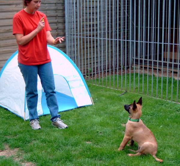 Übungen auf Distanz Übungen Sitz und Platz auf Distanz, klar auch mit Augenkontakt zum Hundeführer! Die vormals gut einstudierten Übungen (Sitz, Platz, Steh) müssen bald auch auf Distanz zum Hundeführer klappen. Der Click kommt jetzt variabel mal sofort, mal erst nach ein paar Sekunden oder nachdem der Hundeführer sich einige Schritte entfernt hat. Alice soll schon jetzt immer Augenkontakt zum HF halten und aufmerksam mitarbeiten. Kleine Hilfen und Handzeichen sind erlaubt und werden erst langsam abgebaut. Und wenn`s mal nicht auf Anhieb klappt, gibts eben keinen Click und mit einem Wort für "das war nicht richtig, versuchs noch mal" in diesem Falle "falsch" wird der Fehler noch bekräftigt. Übung neu beginnen, vielleicht diesmal etwas einfacher (nur einen Schritt weg vom Hund anstatt 3) und bei richtigem Verhalten sofort bestätigen. Bei uns klappts mit nicht ganz 13 Wochen Hund schon ganz gut!