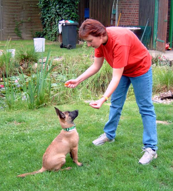 Beginn Sitzübung Sitzübung Auch die Abteilung B beginnt für unsere Alice mit der 8. Woche. Zum punktgenauen bestätigen benutze ich gern den Clicker. So simple Übungen wie Sitz, Platz und Steh baue ich allerdings nicht klassisch über das Shapen aus, sondern gebe dem Hund gewisse Hilfestellungen. Wird das gewünschte Verhalten gezeigt, sagt der Clicker im richtigen Moment; gut gemacht und die Belohnung folgt sofort. Man möge mir meine Ungeduld verzeihen aber ich denke eine kleine Hilfe hier und da schadet nichts. Für die Sitzübung halte ich also ein Futterstück über die Nase des Hundes und führe seinen Kopf etwas nach hinten. Im Normalfall geht der Hintern dann von alleine runter; Click, Futter und schon ist das Sitz bald einstudiert.