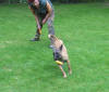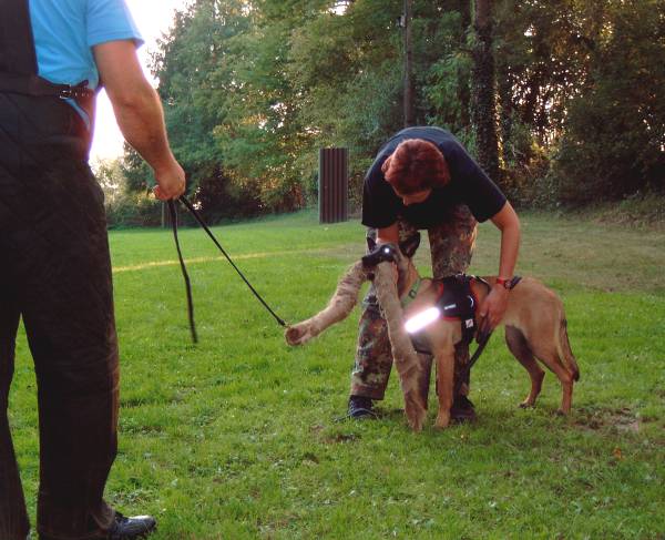 Erste Schritte im Schutzdienst Beute fangen, halten und Kontern, dann Tragen und ruhig halten. Erste Bilder aus der Abteilung C, Alice im Alter von 3 Monaten. Langsam aber sicher kommen die ersten Schritte auch in der Abteilung C. Erst einmal soll Alice Spaß am Beute machen bekommen. Der Helfer hetzt den Welpen hier mit einem Jutesack der zu einer "Babybeißwurst" gedreht wurde. Die Schnur am Säckchen gibt auch nach dem "Schenken" Möglichkeit wieder "Leben" also Bewegung in die vermeintlich tote Beute zu bringen. Ziel ist, dass der Hund lernt sich die Beute selbst zu fangen, also bekommt er sein Triebziel von Anfang an nicht in den Fang gesteckt, sondern muss sich das Säckchen schon selbst holen. Nach Möglichkeit wird die Beute nach kräftigen Kontern des Welpen geschenkt. So wird dem Hund glaubhaft vermittelt, dass er der Gewinner dieser Partie ist und er wird auch beim nächsten Training selbstsicher und mit viel Freude den Übungsplatz zum Schutzdienst betreten. Nach der Abgabe darf Alice ihre Beute tragen und wird ausgiebig gelobt. Der ruhige Griff und auch das Vertrauen zum Hundeführer werden nach einer Runde Tragen mit kurzem Halten im Stand gefördert. Hierzu halte ich eine Hand unter dem Hals des Hundes mit der anderen streichle ich im Beckenbereich. Auch das "Aus" gehört für uns auf jeden Fall schon jetzt dazu. Aus der zuvor geschilderten Ruhephase heraus wird das erste Mal "getrennt" ,hierzu öffne ich ruhig den Fang des Welpen und gebe Kommando Aus! . Sofort nach dem Loslassen macht der Helfer vorne wieder Trieb und der Hund darf wieder Beute machen, dann wird das Aus nicht negativ belegt und das Vertrauen zum Hundeführer bleibt erhalten. (Methode ähnlich nach Dr. Raiser Aus=Trieb) Um den Hund nicht zu verunsichern kommt nicht jedes Mal mit der Ruhephase das Aus, sondern es werden hierbei variable Situationen geschaffen die für den Hund kein Muster ergeben dürfen. Also einmal nach einigen Sekunden Ruhe Aus, beim nächsten Mal einige Sekunden Ruhe, dann wieder weiter tragen lassen. Auf jeden Fall geht der Hund am Ende der Übungsstunde immer als Sieger, also mit der Beute im Fang vom Platz!