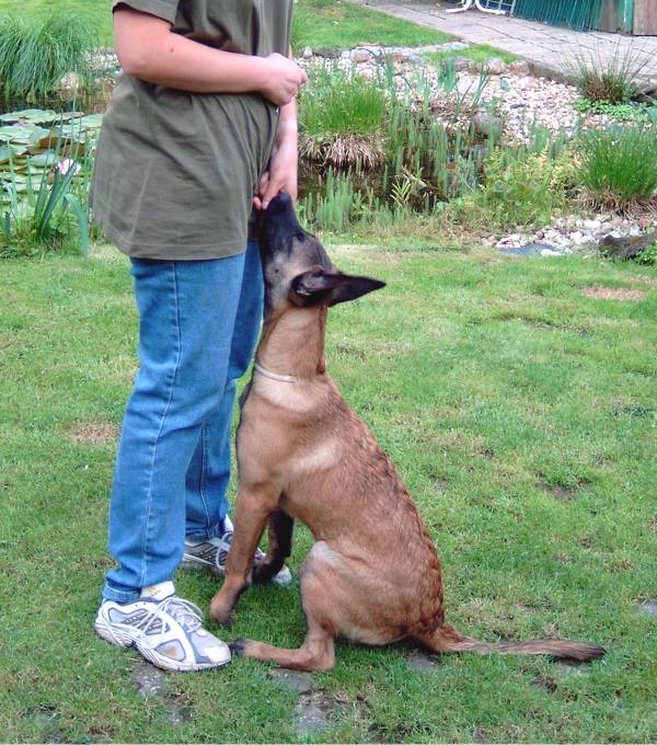 Vorsitzen und einnehmen der Fußposition Enges Vorsitzt und Umlaufen des HF in die Fußposition mit Hilfe der Futterhand Der Hund wird mit dem Kommando Hier zum Hundeführer heran gerufen. Dabei entfernt sich der HF einige Schritte rückwärts um den Hund näher an sich heran zu locken. Das Futterstück halte ich über die Hundenase und führe den Hund so durch Futtertreiben in die gewünschte Vorsitzposition ,möglichst gerade und eng am Hundeführer dann beleibe ich stehen. Sitzt der Hund korrekt wird mit Click und Futter bestätigt. Für die nächsten Trainingseinheiten wird hier die Übung nach dem richtigen Vorsitzen durch ein freies Spiel beendet. Erst wenn der Hund diese Übung absolut verlässlich beherrscht gehen wir zum nächsten Schritt über. Aus dem zuvor einstudierten Vorsitzt soll der Hund nun in die Fußposition überwechseln. Hierzu bestätige ich zunächst das korrekte Vorsitzen dann gebe ich Kommando Fuß und führe den Hund an der Futterhand um den Körper des Hundeführers herum in die korrekte Fußposition. Befindet sich der Hund in der gewünschten Position wird die Futterhand leicht nach oben gezogen um den Hund ins Sitz zu bringen. Sitzt der Hund gerade und eng wird wieder mit Click und Futter belohnt. In den folgenden Übungsstunden wird der Hund nicht nur veranlasst sich vom Vorsitz ins Fuß zu bewegen sondern auch umgekehrt. Das Kommando Hier hat also nicht unbedingt etwas mit schnellem Herbeikommen sondern mit geradem Vorsitzen zu tun. Nach und nach werden die Hilfestellungen mit der Futterhand langsam abgebaut bis nur noch in der Grundstellung eine Belohnung erfolgt.