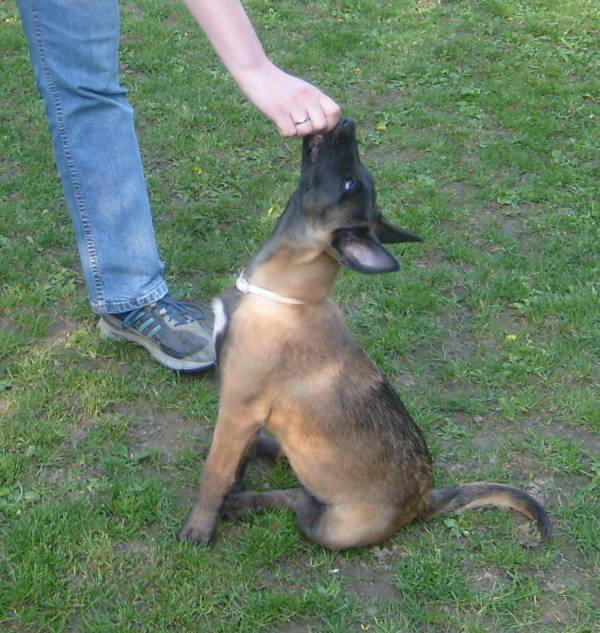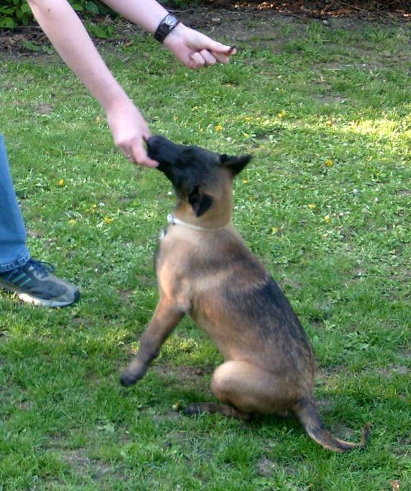 Laut (Cat ist 13 Wochen alt) Das Bellen auf Kommando bringe ich meinen Hunden gern möglichst früh bei. Ich finde, es sehr praktisch, wenn ein Kommando schon vor Beginn der eigentlichen Übung bekannt ist, erst recht wenn in einer Übung wie z. B. dem Stellen/Verbellen ein hoher Triebfaktor das Erlernen einzelner Teilübungen eher schwierig gestaltet. Wenn also ein Hund der bisher nur gehetzt worden ist und immer am Helfer beißen durfte, plötzlich vor dem Helfer abgebremst wird und Verbellen soll, hat das meist zur Folge, dass Hundeführer und Helfer mehr bellen als der Hund. Natürlich gibt es Mittel und Wege auch einen Hund der nicht so gerne bellt diese Übung direkt am Helfer zu vermitteln. Meist ist aber der Stressfaktor dabei sehr hoch und man muss einige Übungsstunden darauf verwenden diesen kleinen Teilabschnitt der Gesamtübung ein zu studieren. Ich finde es praktischer, wenn mein Hund bereits gelernt hat durch bellen auf ein Kommando hin, an sein Ziel zu gelangen. Cat bellt von Natur aus gerne, daher war es hier ein Leichtes das Kommando Laut ein zu bauen. Cat bellt also schon ganz selbstständig wenn sie etwas haben will und es nicht sofort bekommt. Ich brauchte nur mit einem Futterstück vor ihrer Nase rum zu wedeln und sie damit zu ärgern um ihr ein kräftiges Bellen zu entlocken. Dabei wiederholte ich ständig das Kommando LAUT. Nach dem Bellen wurde die Übung mit einem JA und der Futtergabe belohnt. Cat beherrschte die Übung bellen auf Kommando innerhalb von etwa 3 Übungseinheiten und zwar an ein und dem selben Tag. Wie gesagt bellen tut sie wirklich gern. :) Das funktioniert nicht mit allen Hunden so einfach, auf der Seite Ausbildung findet Ihr aber noch weitere Möglichkeiten zum Einstudieren dieser Übung. Jeder Hund lernt diese Übung anders, aber begriffen hat sie bisher jeder. Wenn wir einmal die Übung Stellen/Verbellen beginnen werden, kann ich meinem Hund mit dem bekannten Kommando LAUT plausibel machen, was zu tun ist um an die Beute zu gelangen ohne Stress auf kommen zu lassen. Ab und zu werden wir diese Übung auch, ähnlich gestaltet wie später in der Abteilung C, mit in unser gemeinsames Spiel einfügen. Hier ist das triebliche Niveau geringer als später im Schutzdienst und zum Erlernen einer neuen Übung viel günstiger. Das Abrufen einer bereits bekannten Übung muss dann nur noch unter trieblicher Belastung erfolgen. Hier werden wir dann erheblich weniger Stess hervorrufen als ohne unsere Vorübung.