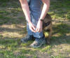 Wechseln in die Fußposition (Cat ist 11 Wochen alt) Cat wird an der Futterhand in die Fußposition gebracht Nachdem die Übung Vorsitzen schon ganz gut klappt, bringen wir Cat auch schon gleich bei in die Fußposition über zu wechseln. Ich halte den Weg um den Hundeführer herum für die einfachste und sicherste Lösung. So denke ich ein zügiges und auch gerades Absitzen fördern zu können. Der Sprung vorne um den HF herum sieht zwar spektakulärer aus, hat aber auch oft ein schräges Absitzen oder ein leichtes Belästigen des HF s zur Folge. Da sich Cat mit Futter sehr gut motivieren lässt führe ich sie einfach mit einem Leckerchen um meine Beine herum und bringe sie, in der richtigen Position mit bekannter Hilfe in die Grundstellung. Da ich diesmal nicht gänzlich mit der Futterhand arbeiten möchte, also kein wirkliches Futtertreiben anstrebe, muss ich mit meiner rechten Hand eine leichte Passivhilfe einbauen. Der Hund wird hier also nicht ins Sitz gedrückt, sondern lediglich am schrägen Absitzen gehindert. Genauso gut klappt das auch mit einem eingebauten Hindernis z. B. einem Zaun oder einer Kiste die verhindert, dass der Welpe nach rechts ausscheren kann.