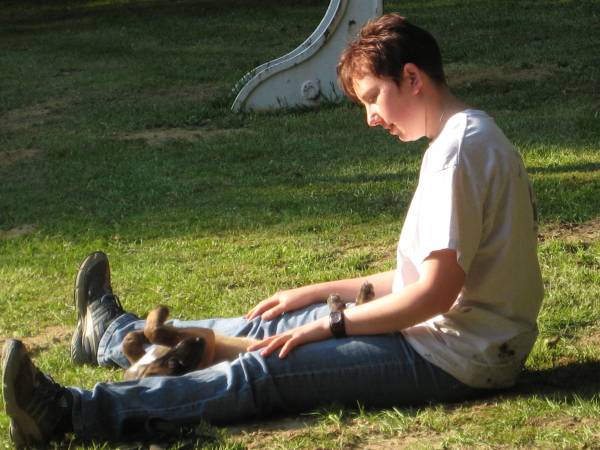 Basisspiel - freies Spiel Cat ist etwa 8 Wochen alt Wie? Ganz egal, Hauptsache es macht Spaß! Zunächst einmal fördern wir das Vertrauen zum Hundeführer in einem gemeinsamen Spiel. Der HF sitzt hierzu auf dem Boden und der Welpe darf über ihn hinwegklettern, wärend er versucht ein Bringsel zu erhaschen oder einen Futterbrocken zu bekommen der eilig vor ihm "davonläuft". Wichtig ist hierbei zunächst nur, dass der Welpe Kontakt mit dem Hundeführer als positiv empfindet und das gemeinsame Spiel beiden Partnern Spaß macht. Cat lässt sich hier auch gern zu einem Zerrspiel animieren und darf dabei fleißig Kontern, und Beutetragen üben. Ins Spiel fließen ganz neben bei schon jetzt Drohbewegungen ähnlich wie in der Abt. C hinzu damit sie dem Hund zur Gewohnheit werden und ich achte darauf besonders tüchtiges und aktives Spiel gleich zu belohnen, indem ich die Beute freigebe. Nach dem Schenken greife ich kurz unter den Fang, damit die Beute ruhig gehalten wird. Wenn der Welpe das jetzt zu akzeptieren lernt, wird mir dieses Verhalten später in der Abteilung C noch sehr nützlich sein. Nur einige Sekunden muss der Welpe die Beute ruhig halten und meine Hand unter dem Fang dulden, dann lasse ich ihn weiterspielen. Für den Anfang soll uns das erst mal genügen.
