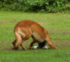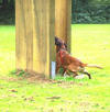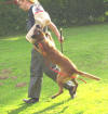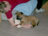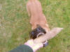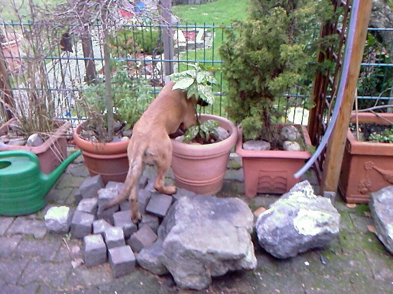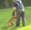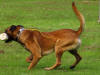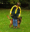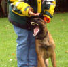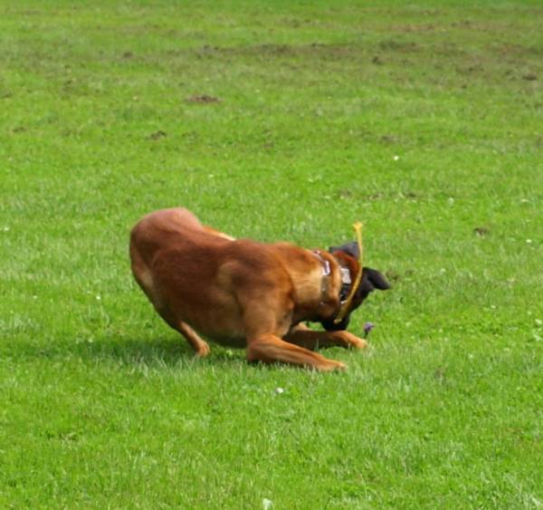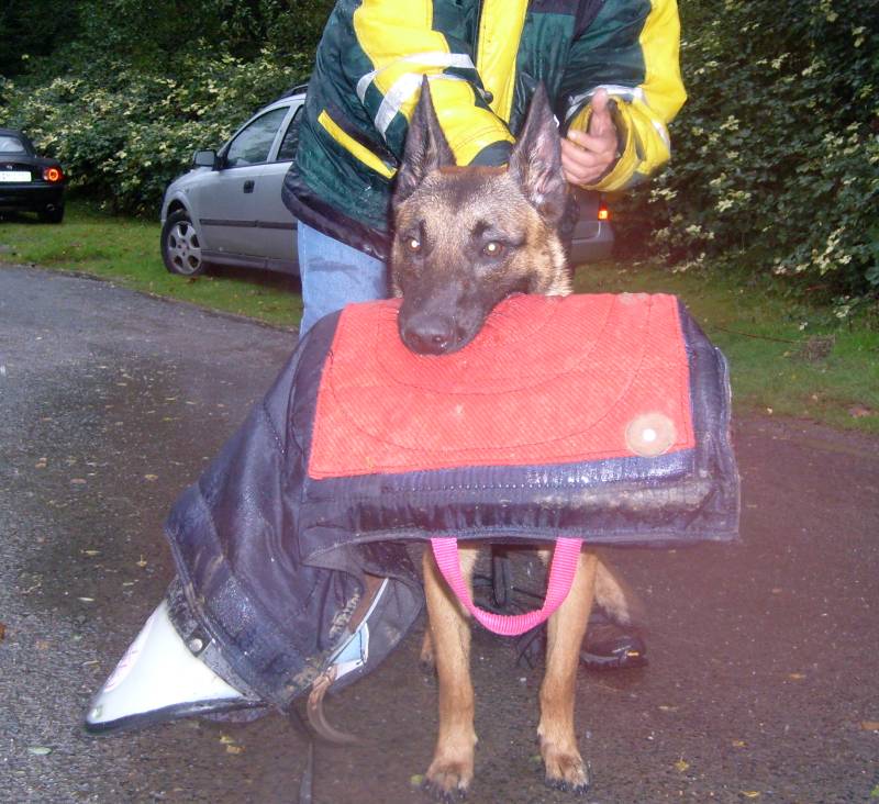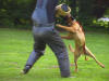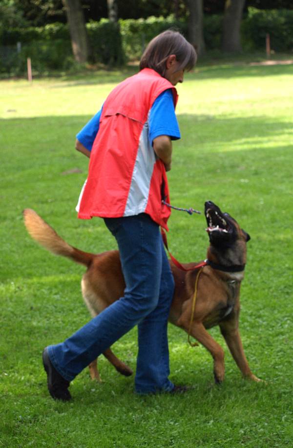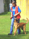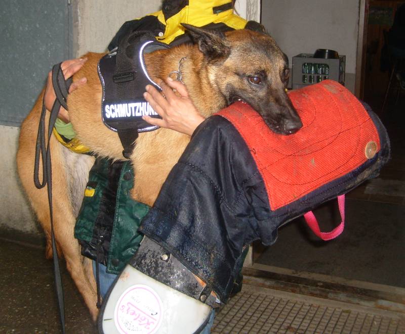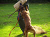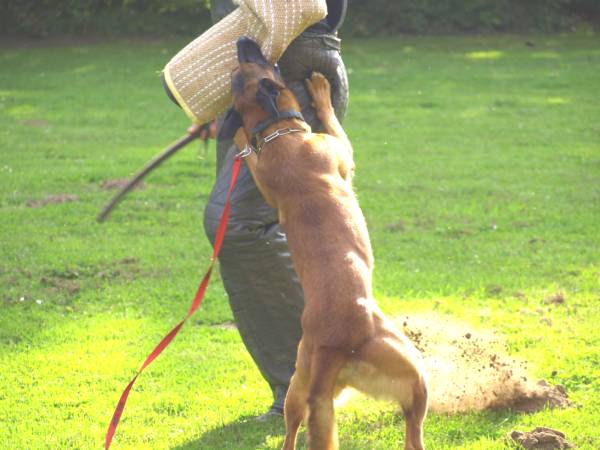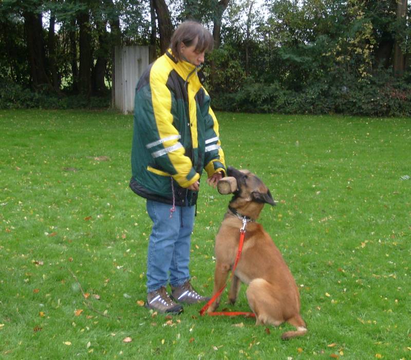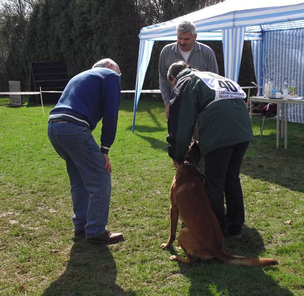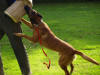 Hier ein kleines Video zur Abt. C Auf den Bildern ist er 11 Monate alt. Also Zähne hat er schon mal alle und obendrein sehr schöne! :) Und außerdem ist er ein superhübscher Kerl geworden! Ganz der Papa! Unterordnung macht er auch schon ganz gut und ist sehr freudig bei der Sache. Sogar apportieren kann er schon, noch etwas ungestüm, aber sehr eifrig. Leider zu schnell für die Kamera. Brigant nach der Abt. C. Das hat er so toll gemacht das Frauchen ihn jetzt auf Händen trägt! Der junge Rüde ist vom äußeren Erscheinungsbild sehr vatertypisch. Dunkelrot mit sehr schöner Maske und von mittlerer Größe. Derb, muskulös, quadratisch, praktisch, gut! Vom Wesen her zeigt er sich absolut frei, freundlich um umgänglich. Von seiner Umwelt ist er unbeeindruckt und bewegt sich in allen Situationen total selbstsicher und überzeugend. Brigant verfügt über enorm viel Beutetrieb und zeigt ein sehr agiles und temperamentvolles Spielverhalten. Er animiert seine Hundeführerin selbständig zum Spiel und fordert sehr harteneckig. In der Abteilung C zeigt er sehr gute Triebveranlagung, ist selbstsicher und hoch belastbar. Die Griffe sind voll und ruhig , so wie es sein soll ! Brigants Frauchen ist ganz vernarrt in ihren Hund und die beiden bilden ein wirklich gutes Team. Uns hat der Besuch bei Euch sehr gut gefallen. Brigant wurde super geprägt und zeigt, dass er das Talent hat, auf jeden Fall ein super Schutzhund zu werden! Wir sind sicher noch viel von Euch beiden zu hören! Brigant bestärkt uns, in unserem Vorhaben bald eine Wurfwiederholung an zu streben enorm!