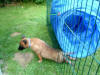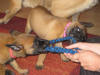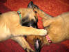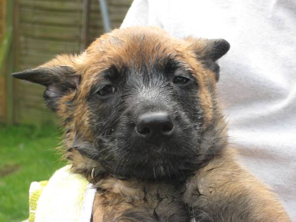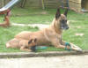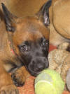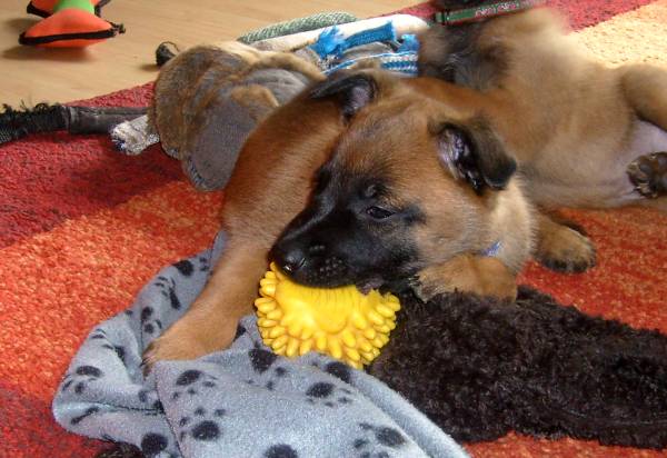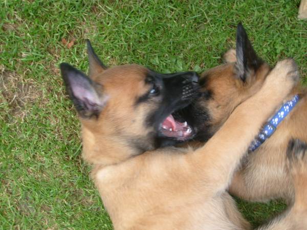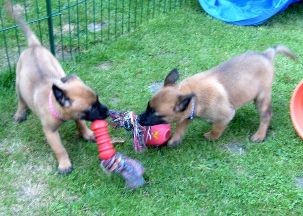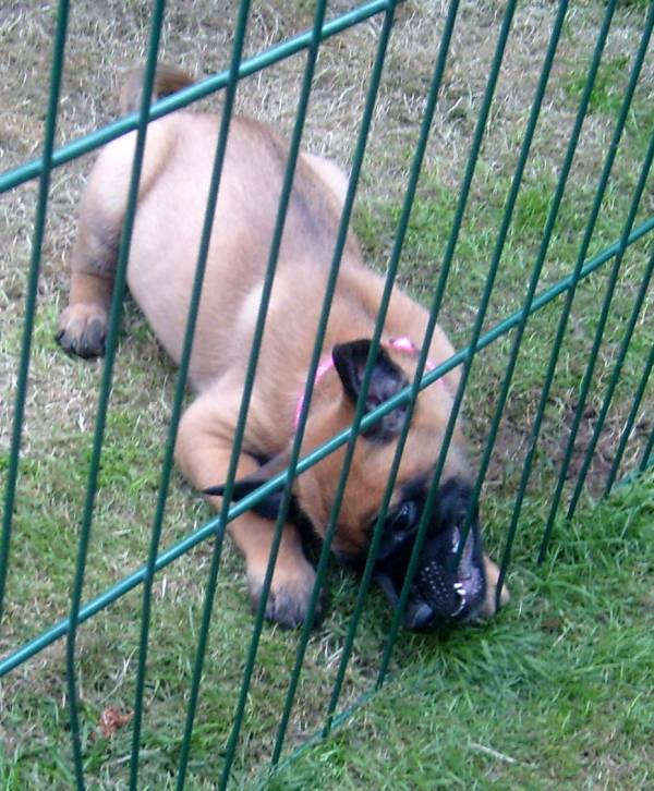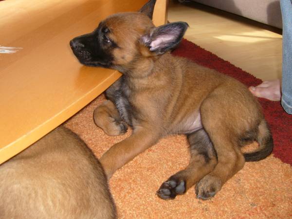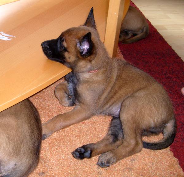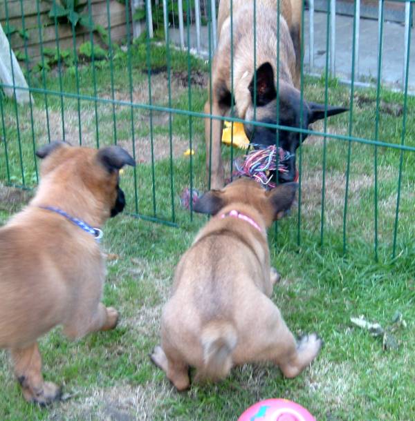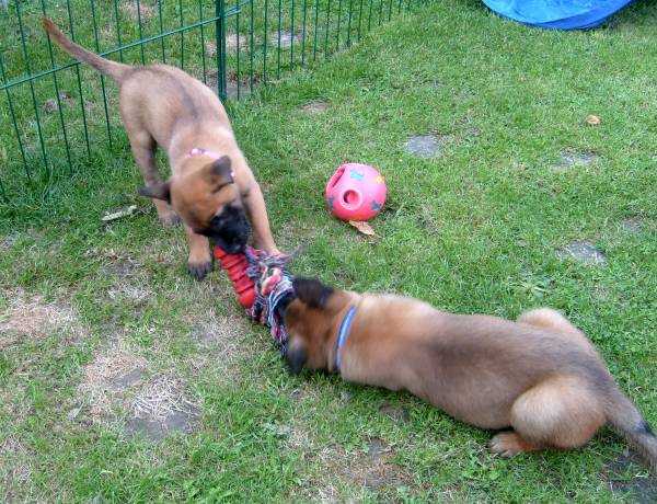Fotos by C. Dohmen Es gibt kein Halten mehr! Nein wir wollen nicht in den Auslauf! Wir wollen auf den großen Spielplatz!! Ausbrecherkönige bei der Arbeit! Nach dem ich alle wieder eingesammelt habe sind die Kleinen mächtig sauer! Dabei gibt es doch auch im Auslauf genügend Spielzeug und Sachen zum erkunden. Cera hat "Stehohren" naja nicht immer aber immer öfter! Cayenn und Cash beim Kampf um das Bringsel; Cayenn der siegreiche Held! Cash kann schon apportieren! Futterlieferung! Cobra knabbert gern alles an und ist mächtig frech, aber Wasser mag sie so gar nicht! Die Ausbrecher sind los! Ich hab mir Sorgen gemacht, dass Cat auf die Welpen tritt... ...dabei musste ich mir eher Sorgen um Cat machen als um die Welpen, sie war nach diesem Überfall erst mal total geschafft! :) Aber Spaß hat es allen gemacht! Die 7. Woche neigt sich ihrem Ende zu und die Welpen zeigen jetzt mehr Lebensfreude und Agilität denn je. Um morgens den Wurfraum sauber zu machen muss man sie wegsperren und sollte man doch noch mal den Raum verlassen müssen wird man im Wohnzimmer mit einer Szene aus einem Hitschock Film konfrontiert. Am besten vergleichbar mit der Abschlusssequenz in "Die Vögel" , nur dass ich niemals die Küche erreiche ohne "angegriffen" zu werden. Da kann man noch so langsam gehen, irrgend wann prescht einer los und die anderen folgen sofort! Da gibt es Katzer und auch zerrissene Hosenbeine, aber das ist eben Hundezucht mit ganzem Einsatz! :) In der nächsten Woche folgen Impfung, Chippen und die Wurfabnahme. Eine anstrengende Zeit für die Kleinen. Danach heißt es Abschied nehmen. Wir hoffen für jeden kleinen Maliattack ein passendes Zuhause gefunden zu haben. Die Zeit ging viel zu schnell vorbei, aber ein paar turbulente Tage stehen uns ja noch bevor. Danach kehrt wieder Ruhe ein, bei uns und wir werden Euch alle sehr vermissen!